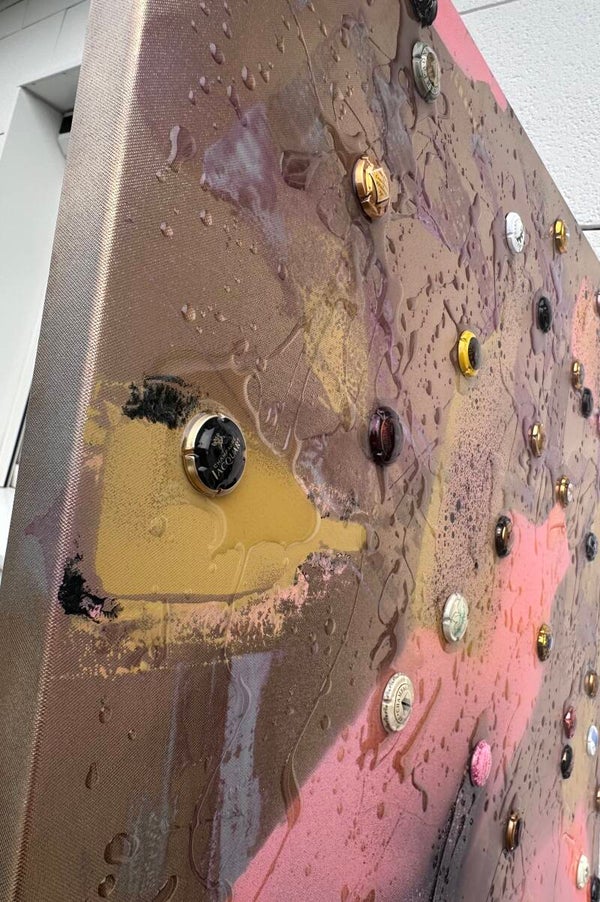Peinture (aérosol) acrylique avec résine et collage des capsules.70cmx70cm