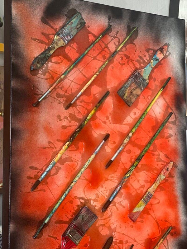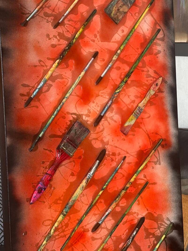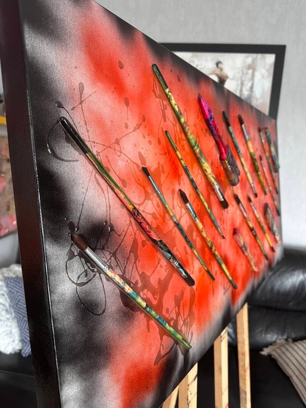 Peinture en acrylique (aérosol), collage des pinceaux avec résine, dimensions 50cmx100cm. Peut être raccrocher selon vos goûts.